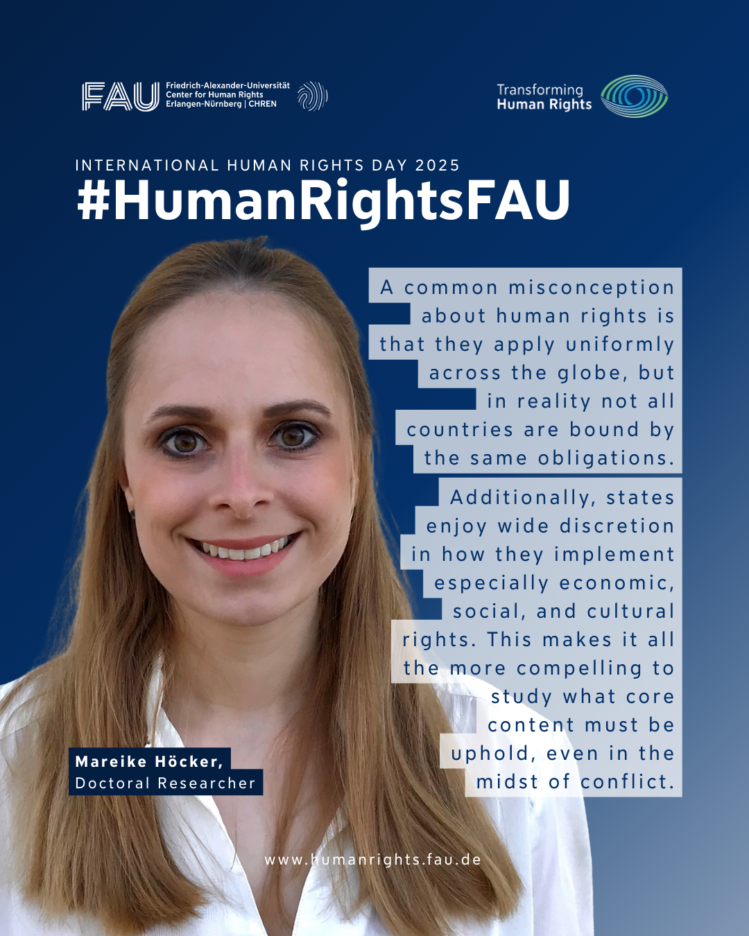 For International Human Rights Day on 10 December 2025, the FAU Research Center for Human Rights Erlangen-Nürnberg (FAU CHREN) invited students, doctoral and postdoctoral researchers to share their personal reflections on human rights.