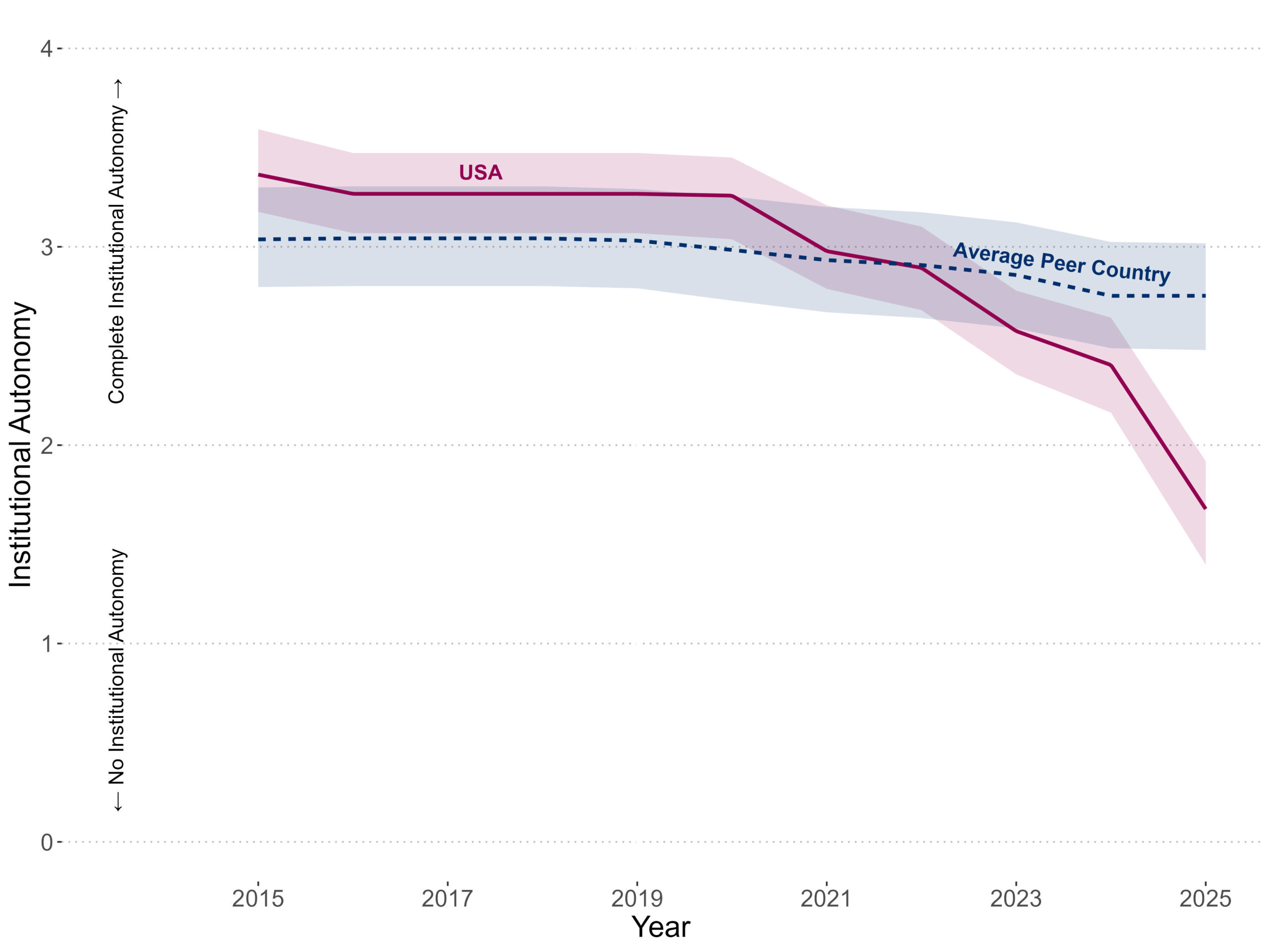 Figure 6: Institutional Autonomy, Development for the US and the Average Peer Country in Western Europe and North America from 2015 to 2025.