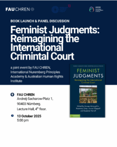 On 13 October 2025, the FAU Research Center for Human Rights Erlangen-Nürnberg (FAU CHREN) in cooperation with the International Nuremberg Principles Academy and the Australian Human Rights Institute, will host the launch of the newly published volume Feminist Judgements: Reimaging the International Criminal Court, accompanied by a panel discussion with the editors and international experts in the field. Published by Cambridge Universtiy Press in July 2025, the book reimagines the relationship between law and gender justice from courts around the world by rewriting judgements through a feminist lens. With over 60 contributions, it explores a wide range of decisions of the International Criminal Court examining the connections between gender, race, nationality, ethnicity, faith, sexual orientation and the practice of the International Criminal Court. The panel discussion will bring together contributors and critical voices to reflect on the implications of feminist legal interventions for the ICC, and to debate how a more inclusive, diversity-aware approach to international criminal law can be developed in theory and practice.